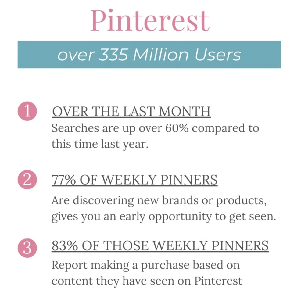 As a creative entrepreneur it is important to know these numbers! I know they’re boring, but these numbers mean that you are missing out on millions of Pinners seeing your products if you're not using Pinterest! Getting excited yet?!