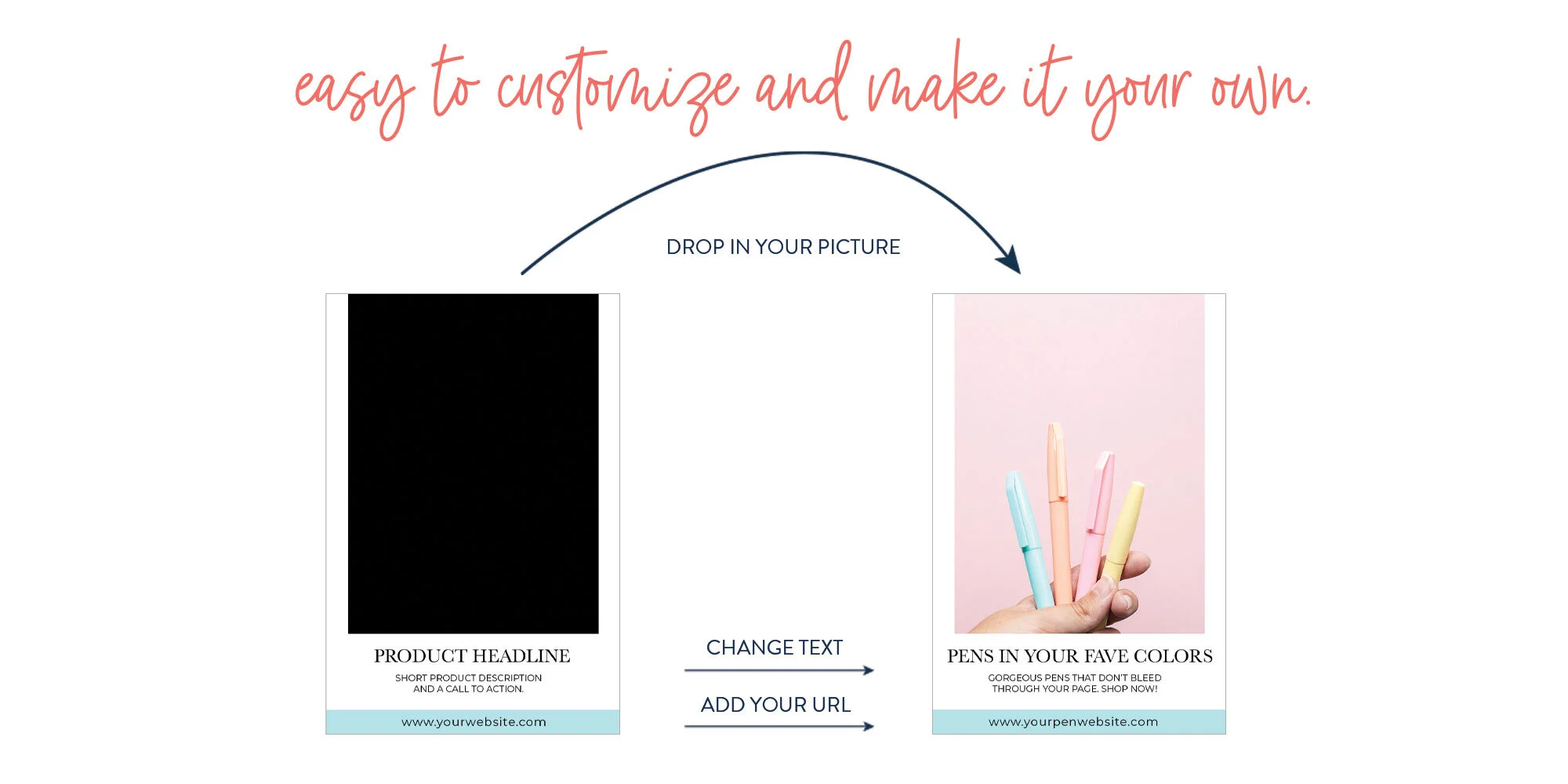 Once you have the file open in your favorite program, all you have to do is drop in your product photo, change any colors to match your brand, and edit the text areas to match your description and website URL…add your logo too if you . After that, your graphic is good to go!